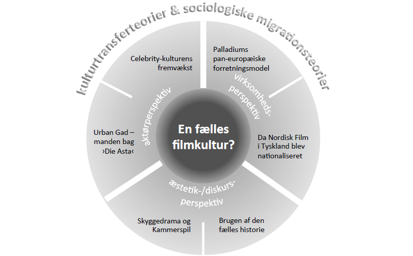 Med dette kollektive dansk-tyske projekt ønsker vi at afdække relationerne mellem den danske og tyske filmbranche fra 1910 til 1930, hvor først tonefilmens indtog og siden Hitlers magtovertagelse ændrer vilkårene i den tyske filmbranche og den internationale udveksling i filmbranchen radikalt. Perioden dækker de tiår, hvor dansk film vandt international storhed og faldt, netop da tysk film brød igennem med stilskabende værker som Dr. Caligari (1920/Das Cabinet des Dr. Caligari) og F.W. Murnau og Fritz Langs ekspressionistiske film, der trak på teknikker, som visse filmhistorikere har argumenteret for, stammede fra dansk film. Projektets hovedspørgsmål lyder: hvordan udspillede kulturudvekslingen mellem to af Europas vigtigste filmnationer sig fra 1910-30? Dette spørgsmål bryder med dominerende tradition inden for filmhistorieskrivningen for at operere ud fra et snævert nationalt perspektiv, for projektets fokus, teori og metode er i udgangspunktet transnationalt. I forskningen om dansk og tysk film findes tidligere tilløb til at belyse samspillet transnationalt, men næsten udelukkende virksomheds- og personhistorisk; i forhold til de store selskaber og de store stjerners rolle og ageren. Dette projekt bidrager til film- og kulturhistorien ved en systematisk empirisk undersøgelse af et langt større antal film, personer og selskaber, som orienterede sig internationalt, nogle af dem decideret globalt, længe inden nogen begyndte at tale om globalisering. Og inkorporerer æstetisk-stilhistorisk analyse i afdækningen af udvekslingen mellem landene, forsøger at spore, hvilke veje kunstnerisk inspiration og påvirkning fulgte og hvordan udvekslingen blev forstået og beskrevet i brancheblade og dagspresse.