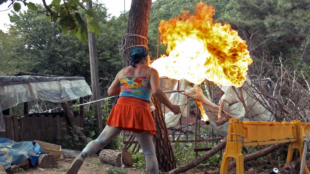 The film includes an odd juxtaposition between the abandoned building and a performance taking place right behind it, with gaudily dressed, face-painted dancers and musicians.