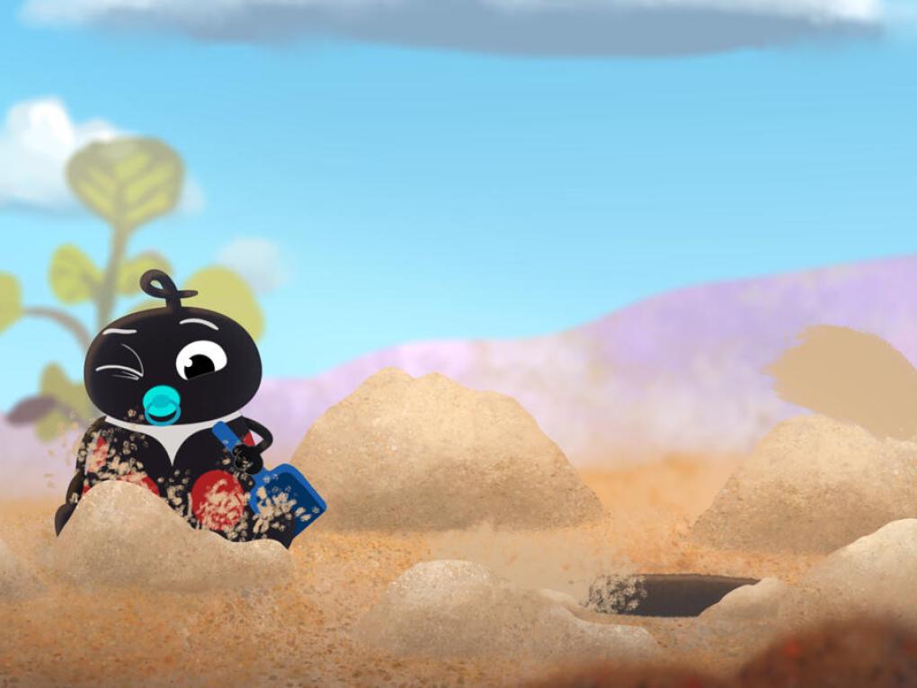 Bror og Marie graver huller i sandkassen. Marie graver et stort hul. Mens hun graver, kommer hun til at dække Bror…