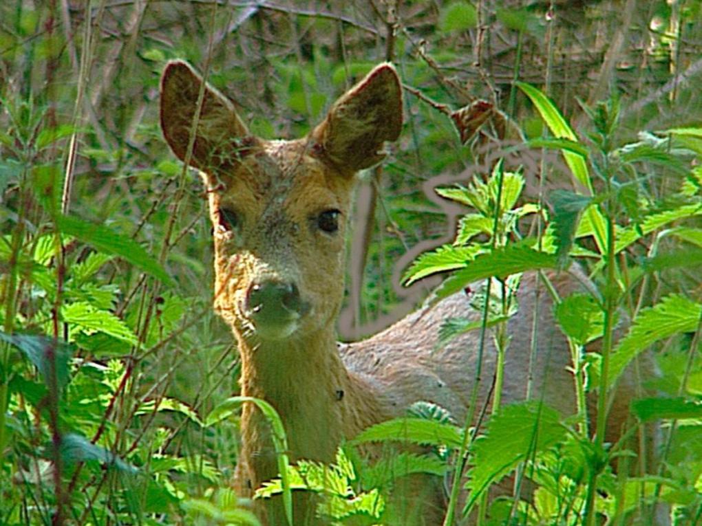 Rådyr er sky. Ofte står de på marken og spiser, skjult i det høje korn. Det er højsommer og parringstid.
