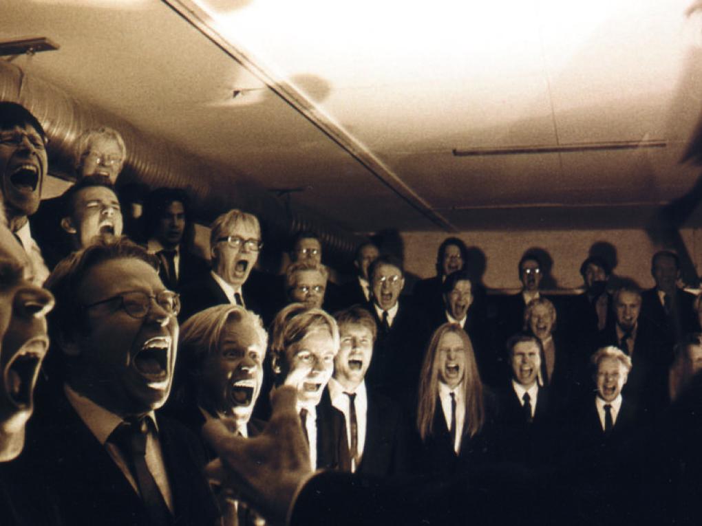 Det finske mandskor, Mieskuoro Huutajat, klædt i sorte jakkesæt, hvide skjorter og gummislips opfører deres…