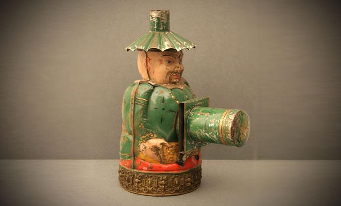 Den Buddha-formede laterna magica er en af kronjuvelerne i Filmarkivets samling af historiske apparater. Den er fremstillet af franskmanden Louis Aubert i ca. 1879. Louis Aubert var en af de førende producenter af laterna magica på det europæiske marked. Buddha’en anses som et af hans mesterværker. Teknikken rækker dog meget længere tilbage i historien.