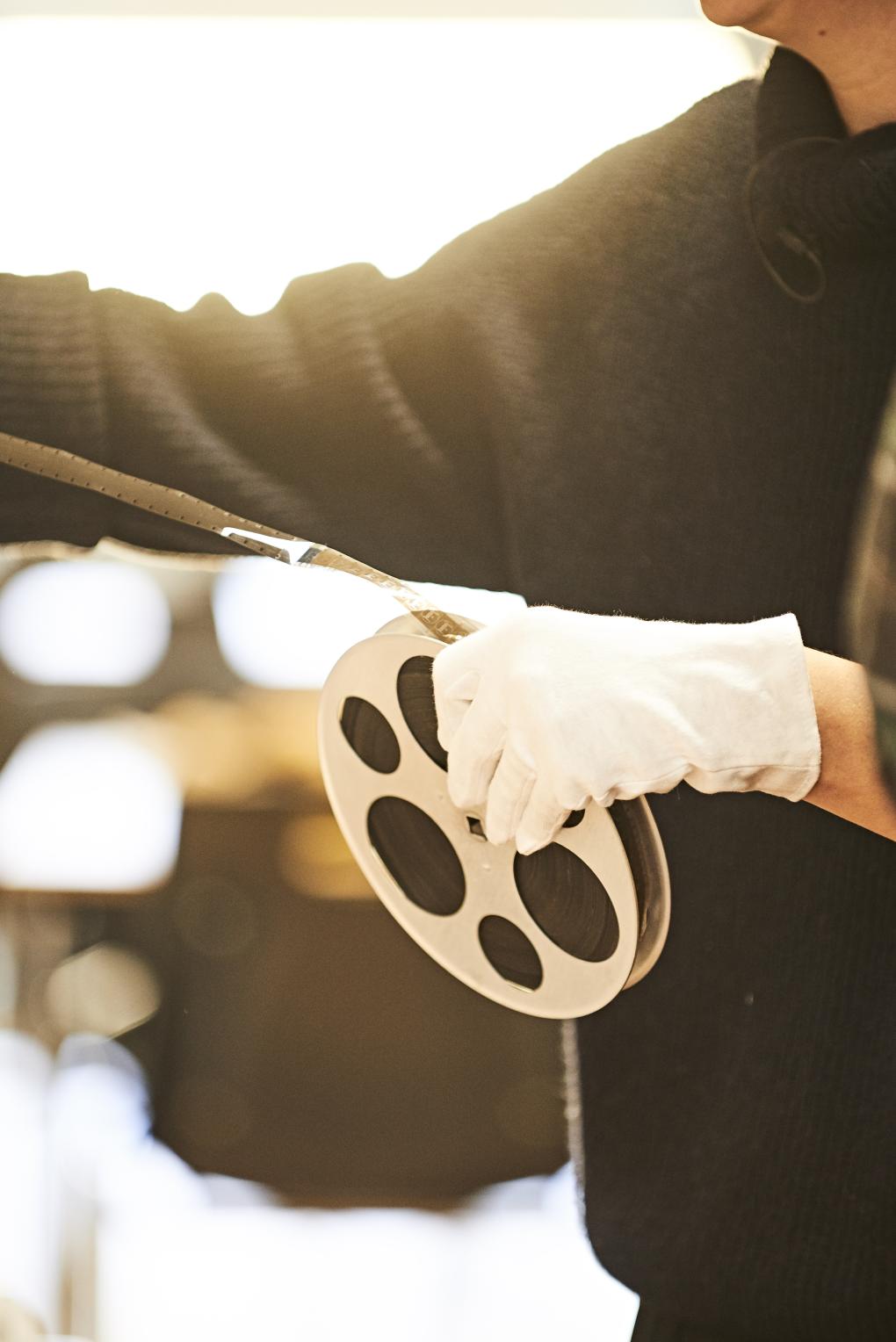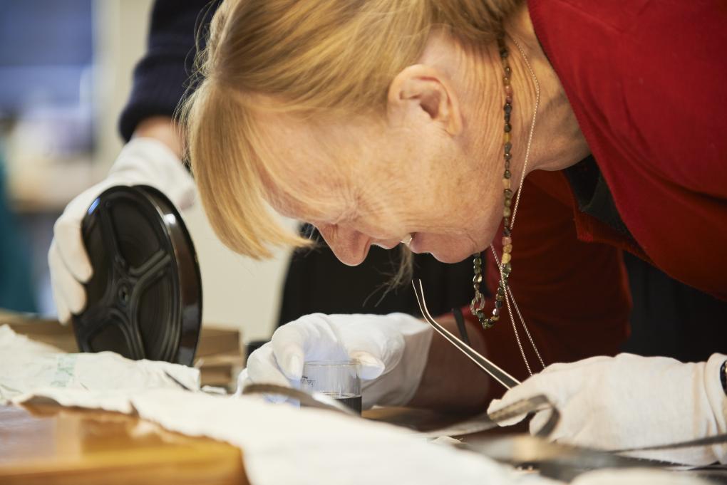 Filmarkivar Katrine Madsbjerg undersøger, hvilken stand en af de gamle film er i. Foto: Rocco Peditto.