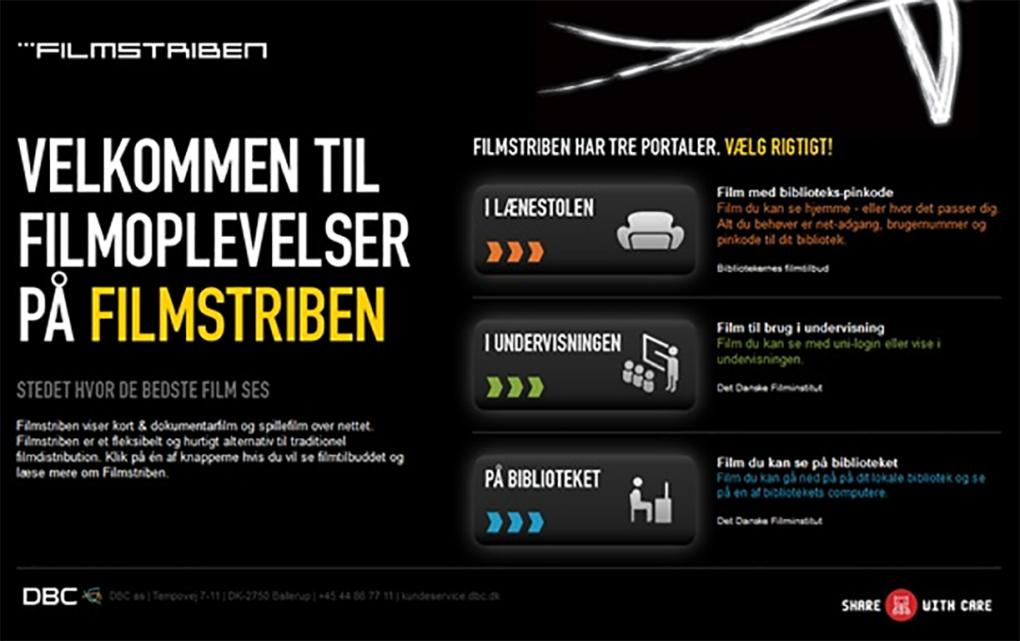 'På biblioteket' bruger du, hvis du sidder på et bibliotek. Filmene kan ses på bibliotekets computere, tv-skæme, storskærme m.v. af enkelte brugere eller ved publikumsarrangementer. Er du i tvivl om din kommunes biblioteker abonnerer på Filmstriben, skal du kontakte dit lokale bibliotek.