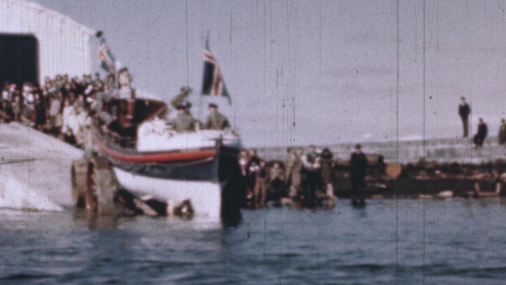 Vígsla Björgunarstöðvar Slysavarnafélags Íslands í Örfirisey árið 1946, þar sem björgunarbátum er ýtt úr vör og mikilvægum áfanga í Slysavörnum er fagnað.